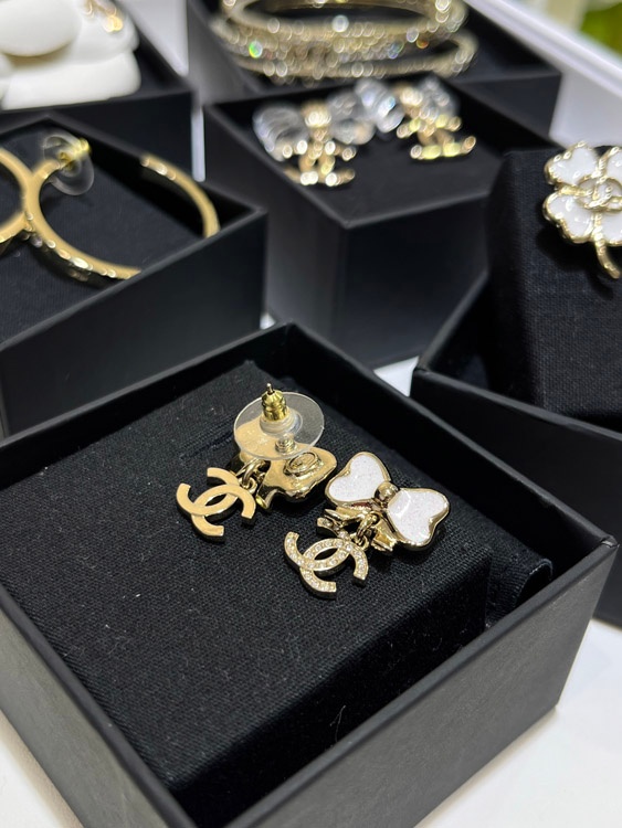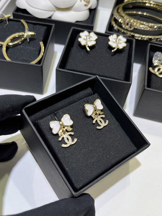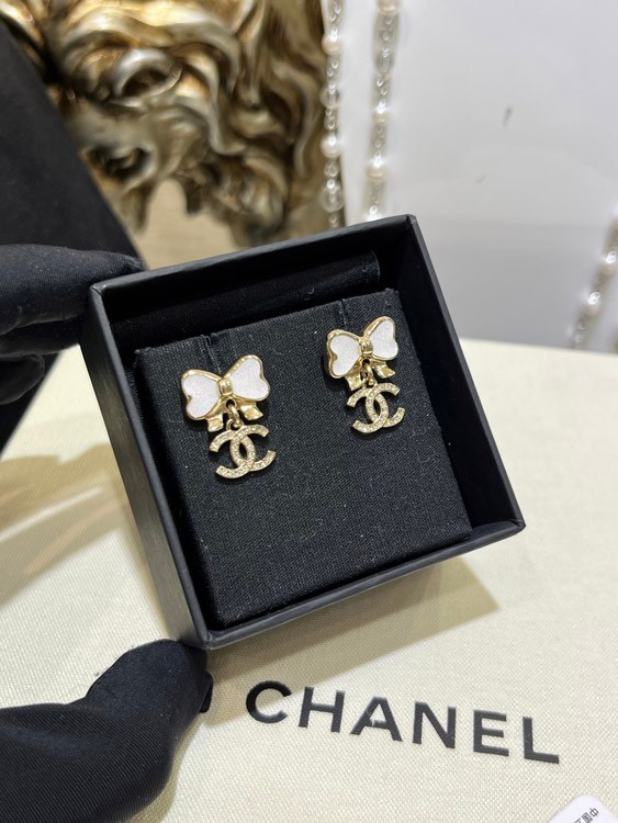 Home > Chanel white glitter enamel bow gold full diamond double C earrings-3745