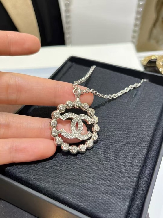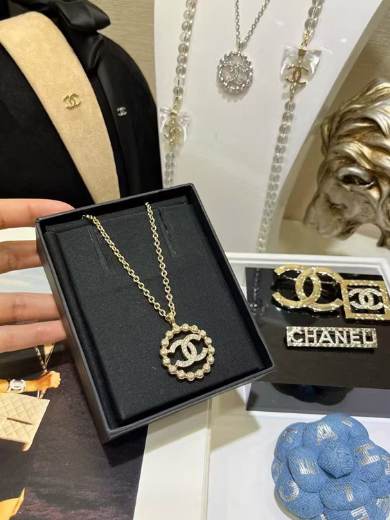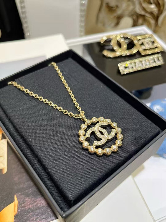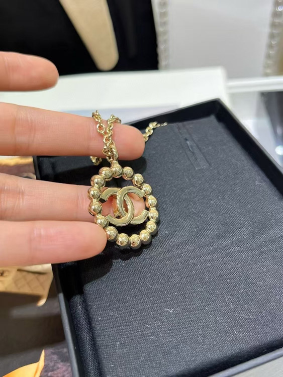 Chanel gold full diamond double C hollow round necklace-3748