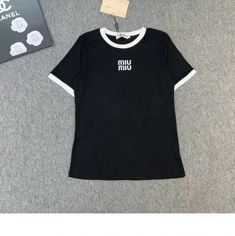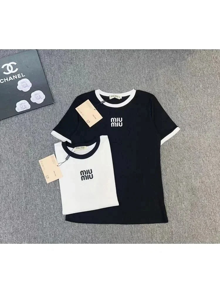 MIUMIU 2025 New Round Neck Contrast Color Letter Print Loose Short Sleeve T-shirt-2583
